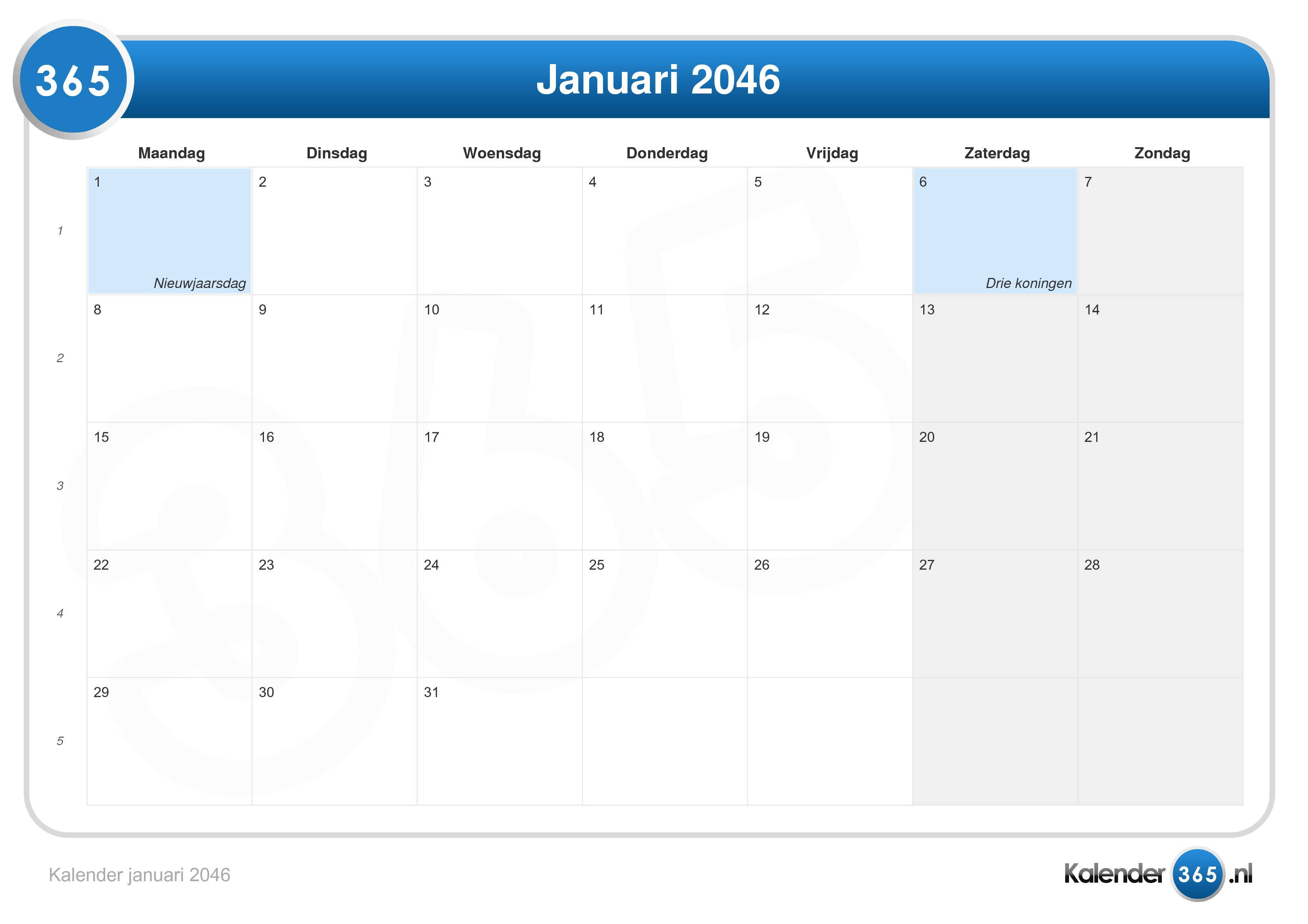 Kalender januari 2046 (Liggend formaat)Ga naar Kalender 2046.