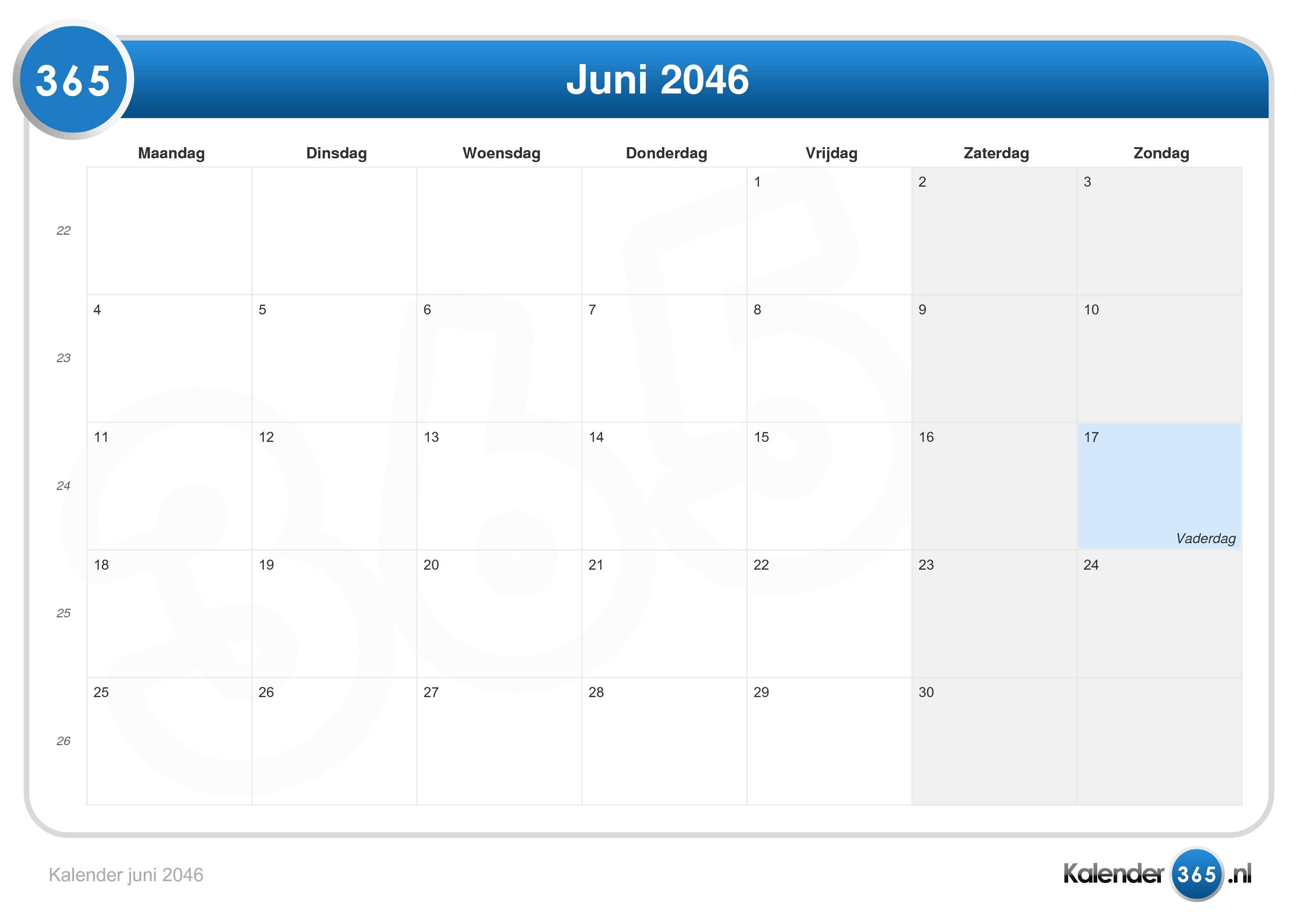 Kalender juni 2046 (Liggend formaat)Ga naar Kalender 2046.