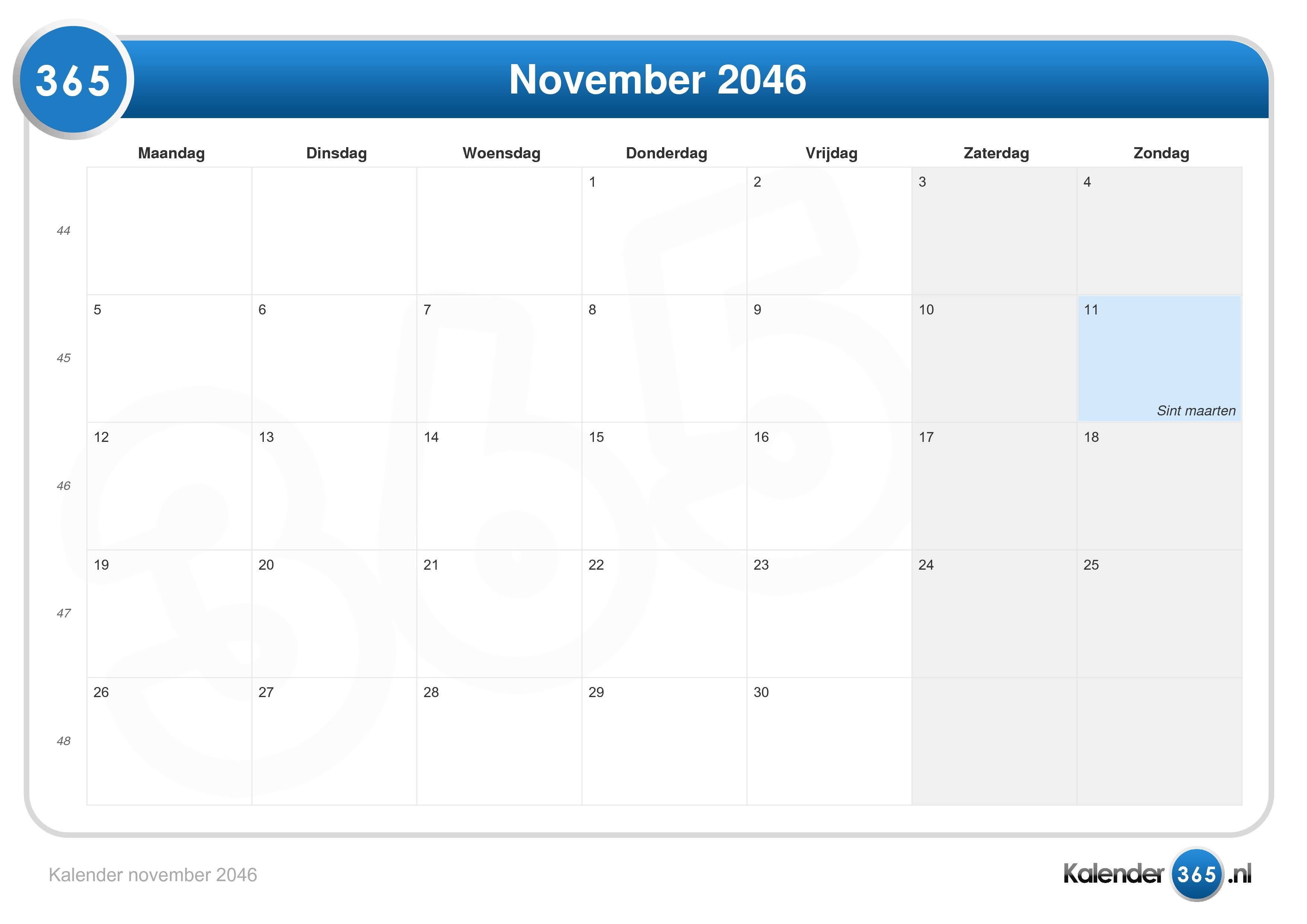 Deze november 2046 kalender is altijd handig om bijvoorbeeld te zien wanneer je vakantie hebt.
